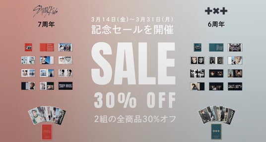 また、Stray Kidsがデビュー7周年、TOMORROW X TOGETHERがデビュー6周年を迎える3月を記念し、この2組に関連する商品を本体価格より30%オフの特別価格でご提供いたします。この機会にぜひお求めください。