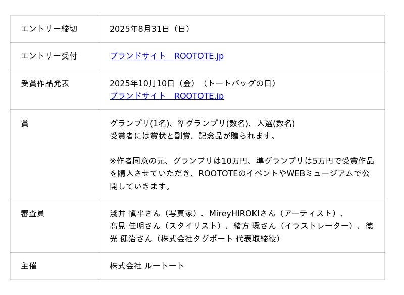 トートバッグ専門ブランドROOTOTE(ルートート)を展開する株式会社ルートート(本社:東京都渋谷区/代表取締役:神谷富士雄)は、2025年10月10日(トートバッグの日)に、「第22回 トート・アズ・キャンバス アート&デザインアワード by ROOTOTE」の受賞作品をブランドサイト「ROOTOTE.jp」にて発表いたしました。