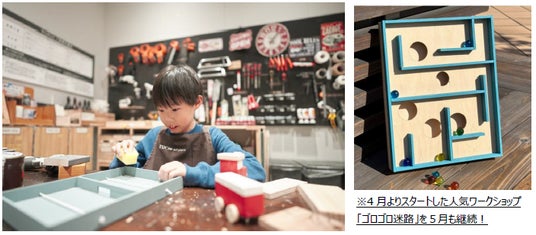 “子供でも作れるタイルを使ったワークショップがあったら嬉しい!”というお客さまのリクエストから生まれた「カラフルフック」、毎年大人気のマスキングテープ「mt.」を使用した新作ワークショップ、4月より新しくスタートし人気となっている「ゴロゴロ迷路」など、毎日通っても楽しめるDIYメニューが盛りだくさん!作りたいものが決まっている方は、工作室の利用もお勧めです。
