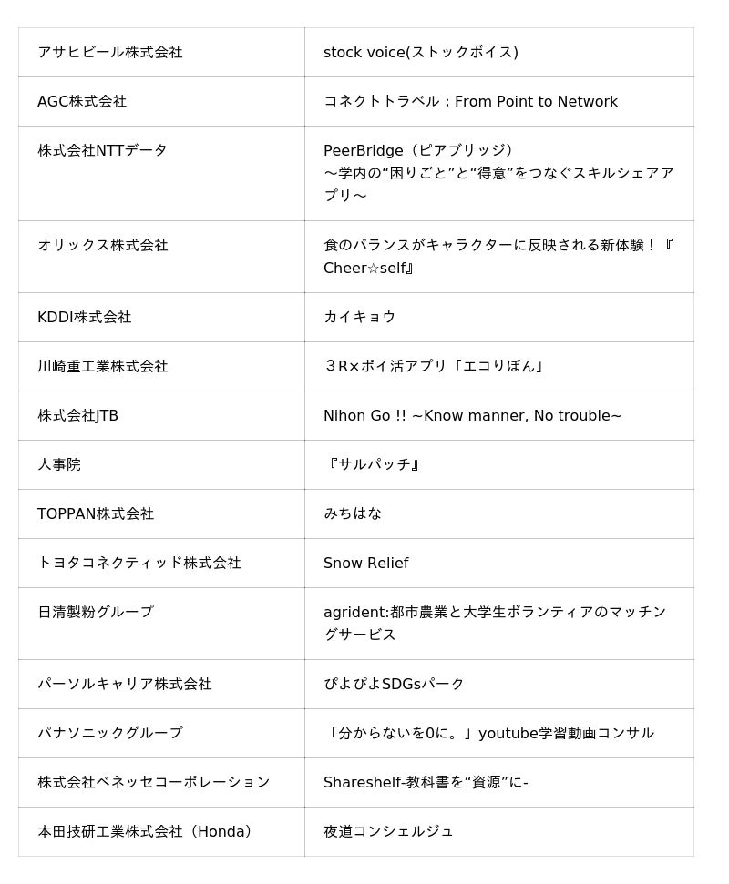 アサヒビール、AGC、NTTデータ、オリックス、KDDI株式会社、川崎重工業、JTBグループ、人事院、TOPPAN、トヨタコネクティッド、日清製粉グループ、パーソルキャリア、パナソニックグループ、ベネッセコーポレーション、本田技研工業(Honda)他 ※五十音順