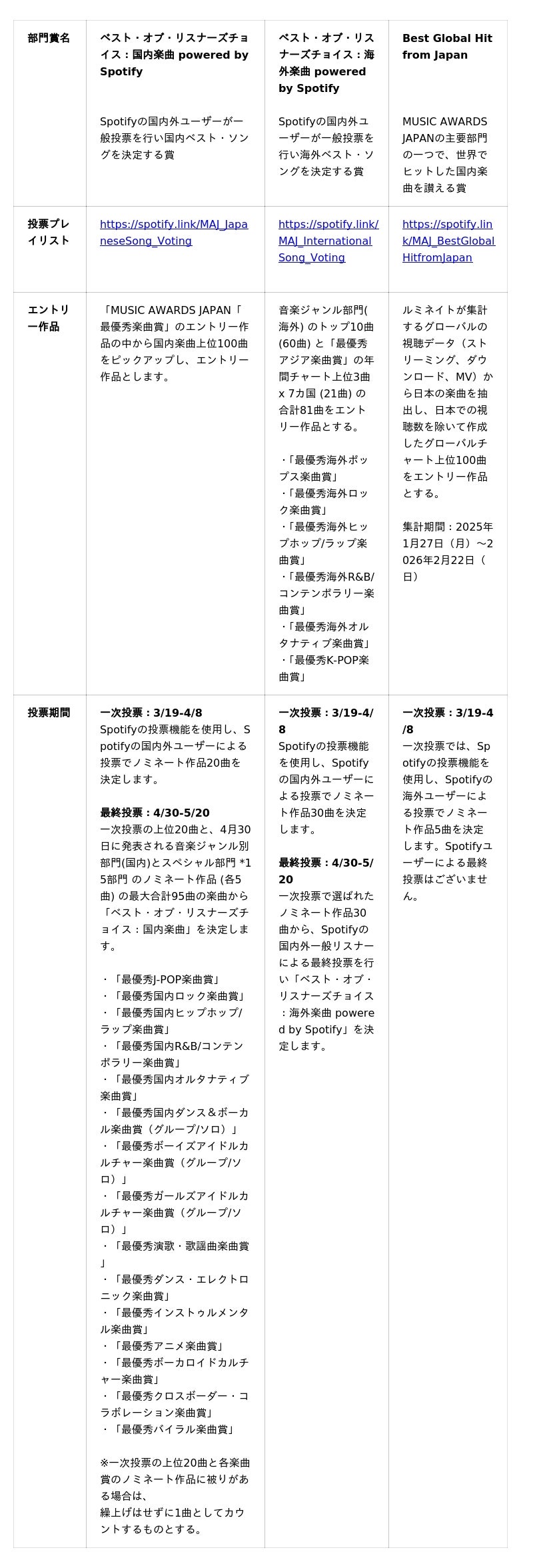 世界で7億5100万人以上が利用するオーディオストリーミングサービス Spotify(会社名 Spotify AB / 本社 Stockholm、Sweden)は、一般社団法人カルチャーアンドエンタテインメント産業振興会(CEIPA)主催の国内最大規模の音楽賞「MUSIC AWARDS JAPAN」(以下、MAJ)の一般投票部門において、Spotifyユーザーの投票により受賞作品が決定する「ベスト・オブ・リスナーズチョイス」2部門と、主要6部門のひとつ「Best Global Hit from Japan」の投票を、2026年3月19日より開始することをお知らせいたします。