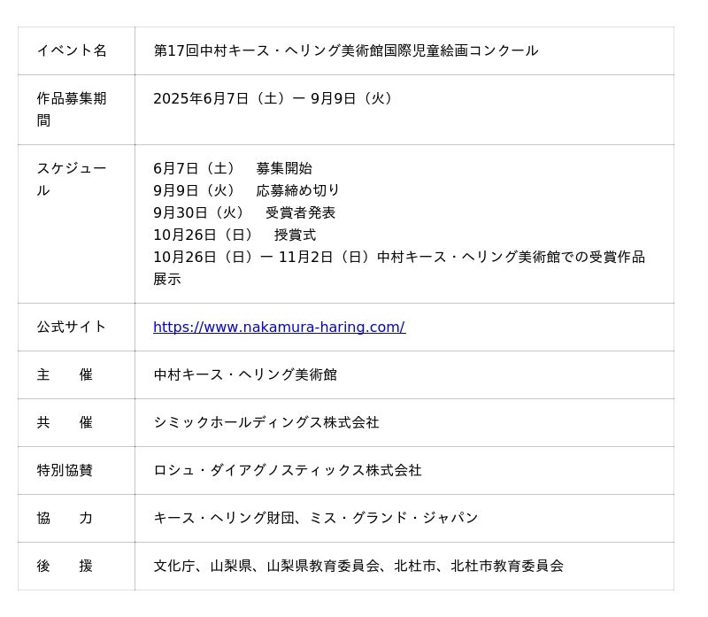 中村キース・ヘリング美術館(山梨県北杜市小淵沢町)では、2025年6月7日[土]より、「第17回 中村キース・ヘリング美術館国際児童絵画コンクール」の作品募集を開始いたします。(応募締切:2025年9月9日[火]必着)