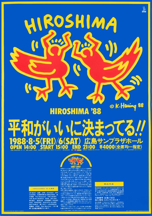 1980年代のアメリカ美術を代表するアーティスト、キース・ヘリング(1958-1990)は、1988年に行われた原爆養護ホーム建設のためのチャリティコンサート「HIROSHIMA ’88」のメインビジュアルを手がけたことを機に広島を訪れました。当館では、ヘリングが同コンサートのために制作した3種類のポスターを、7月・8月・9月と月替わりで展示いたします。あわせて、広島訪問の記録や背景を紹介する映像「キース・ヘリングが見た広島」を館内の「オープンスペース」(入館料無料)にて上映。アーティストとして、また一人の人間としてヘリングが広島と向き合った姿を、当館の調査に基づき制作された資料映像でご覧いただけます。