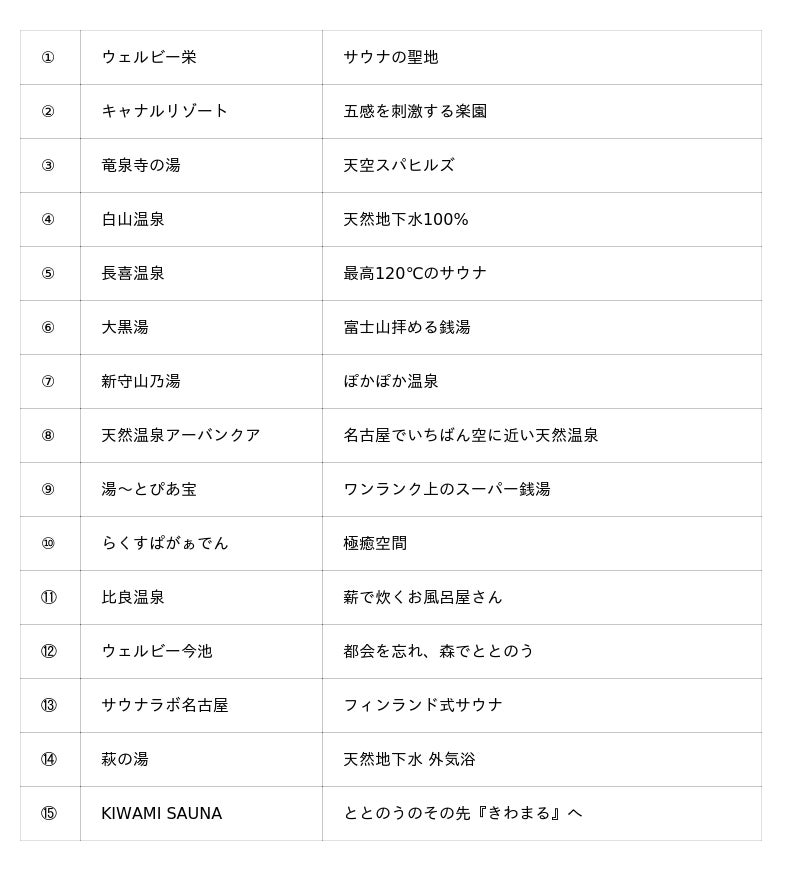 今回のキャンペーンでは、120℃の高温サウナを誇る「長喜温泉」、富士山を臨める「大黒湯」、薪で炊く昔ながらの「比良温泉」、フィンランド式にこだわる「サウナラボ名古屋」など、個性豊かな施設が参加。それぞれの施設で異なるサウナ体験を楽しみながら、名古屋のまちを巡ることができます。
