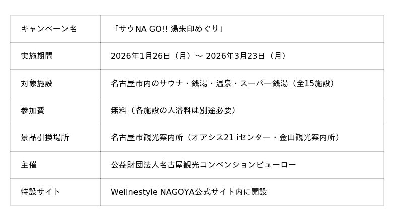 公益財団法人名古屋観光コンベンションビューロー(所在地:愛知県名古屋市、理事長:飯田 貢)は、名古屋市が推進する都市型観光プロジェクト「Wellnestyle NAGOYA」の一環として、2026年1月26日(月)から3月23日(月)まで、サウナ・銭湯・温泉・スーパー銭湯など市内15の温浴施設を巡る「サウNA GO!! 湯朱印めぐり ~サウナの聖地なごやでまちめぐり!~」を開催いたします。