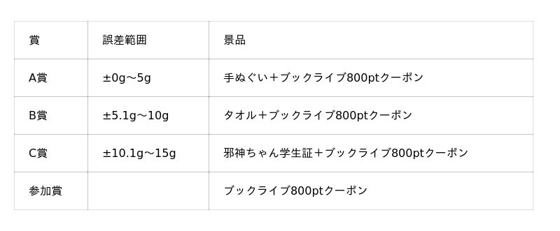 サイコロで出た目に応じた目標のグラム数を目指して、邪神ちゃんのしっぽを切ってください。目標のグラム数との誤差に応じて、邪神ちゃん限定グッズをプレゼントします。また、参加いただいた方全員に総合電子書籍ストア「ブックライブ」でご利用いただける800ptを贈呈します。