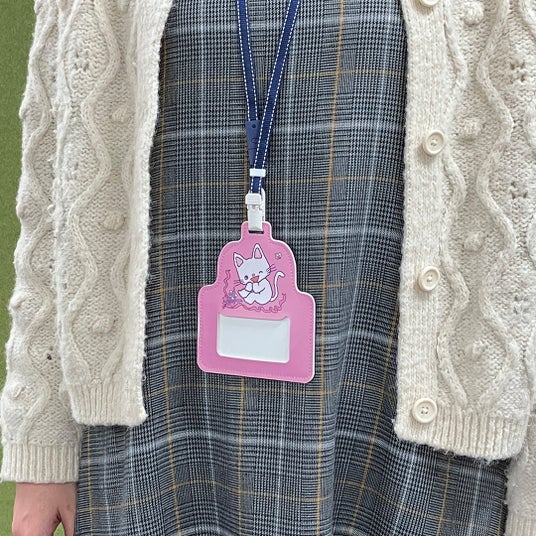 ホルダーの部分は名刺サイズのカードが入る大きさで、市販のネックストラップをつけて首から下げたり、安全ピンをつけて服やカバンに装着したりと様々な使い方ができます。