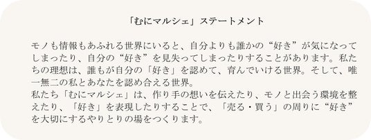 - 連動企画「みんなのむに」SNS企画「わたしのむに」がマルシェの会場にも登場します。特設コーナーの専用カードに、“わたしにとっての唯一無二”を自由に記入して参加してください。この企画には、マルシェ出店者の皆さんも参加します。