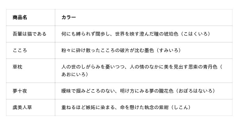 2021年から現在までに、宮沢賢治・太宰治・京極夏彦・江國香織・森見登美彦・江戸川乱歩・凪良ゆう 各氏の作品をモチーフにした商品を展開し、2025年9月時点で累計販売数3万5,000本を突破しました。