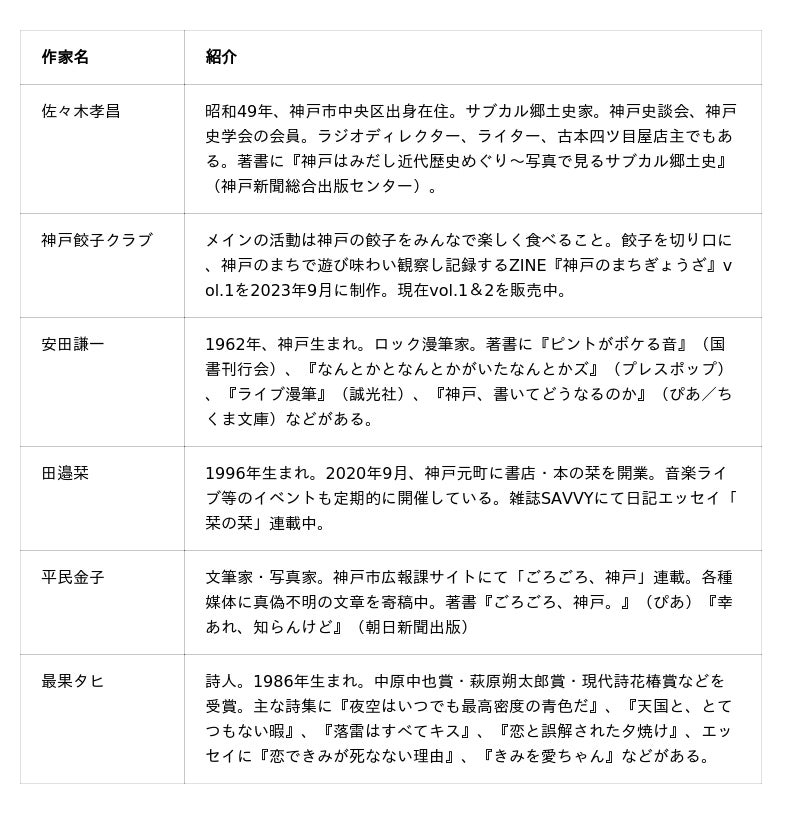 ・作品執筆作家:佐々木孝昌 / 神戸餃子クラブ / 安田謙一 / 田邉栞 / 平民金子 / 最果タヒ