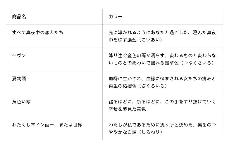 今回の「川上未映子」シリーズでは、細かなパール状の粒子やフレークホロを入れたテクスチャーにより、作品の根底に流れる、記憶の奥行きや、大人と少女のあわい、自我はどこにあるのかを問う不安定さを表現しました。また、5色いずれも、作品の主題や印象的な情景を抽出し、「日本文学」にちなんで和の色名を用いています。