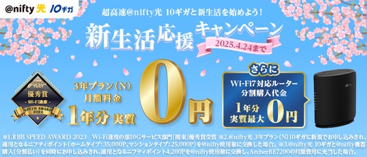 ニフティ株式会社(本社:東京都新宿区、代表取締役社長:前島 一就)は、「@nifty光 10ギガ」の新規申込者を対象とした「新生活応援キャンペーン」を本日2月3日(月)から開始します。