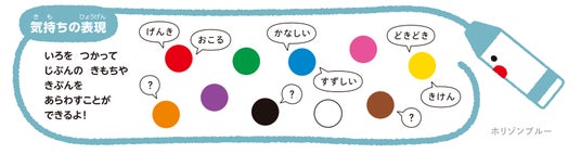 赤は「げんき」「おこる」、青は「かなしい」「すずしい」、オレンジや黒はどんな気持ちかな?