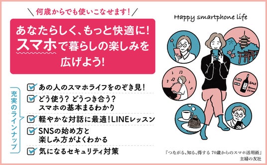 『つながる、知る、得する 70歳からのスマホ活用術』はスマホをもっと使いこなしたいと願うシニア世代に向けた一冊。知っておきたいスマホの基本から、同世代女性のスマホ活用実例、もっと使いこなしたいLINEやSNSについても情報満載です。
