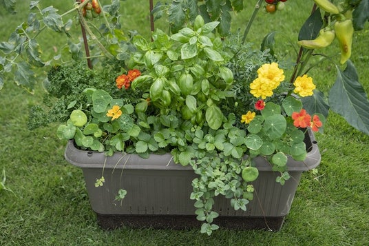 ミニトマト、ピーマン、ナス、インゲンマメなどの野菜から、ローズマリー、タイム、バジルなどのハーブに、マリーゴールドやナスタチウムなどコンパニオンプランツやエディブルフラワー、そして果樹のブルーベリーまで、多種の苗を1~2株植えることで、幅広い収穫を楽しみます。