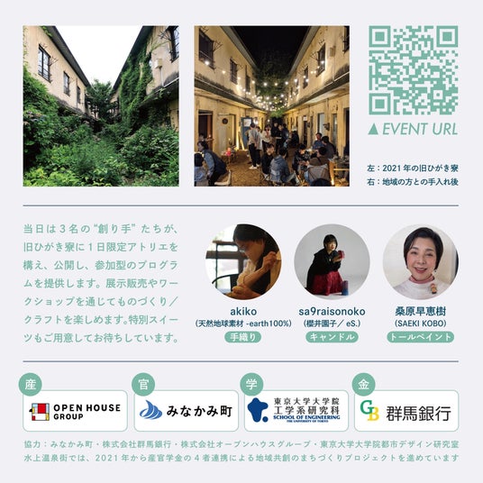 5/17(土)「おためしオープンアトリエ#1」を初開催!創り手が営む1日限定のアトリエで、ものづくりの魅力を体験 産官学金連携の水上温泉街再生PJ