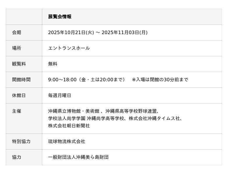 本展では、夏の大会の象徴である深紅の大優勝旗を展示するとともに、沖縄尚学の優勝までの軌跡と、県民が喜びに沸く様子を、新聞紙面と写真のパネルで振り返ります。