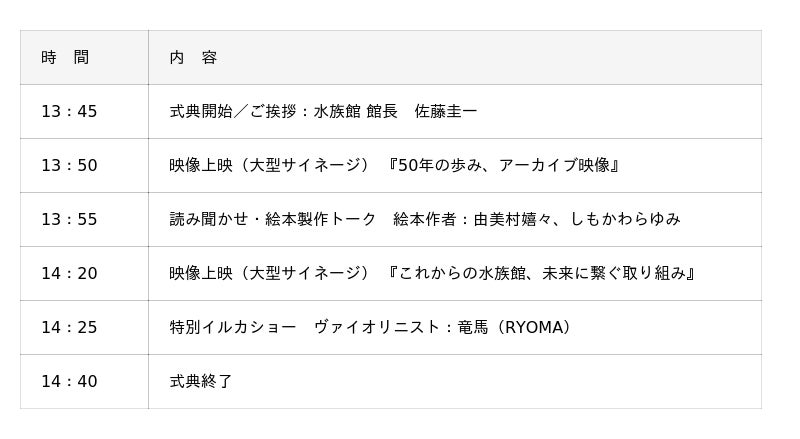 催しの中では『50年の歩み、アーカイブ映像』の上映に加え、水族館の役目と挑戦を伝える『これからの水族館、未来に繋ぐ取り組み』を大型サイネージで紹介します。
