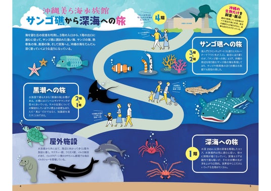 ◆ 沖縄の海をそのまま再現した展示構成を完全ガイド・サンゴ礁の浅瀬から黒潮、深海へと潜るような館内構造を、フロアマップとともに詳細紹介。