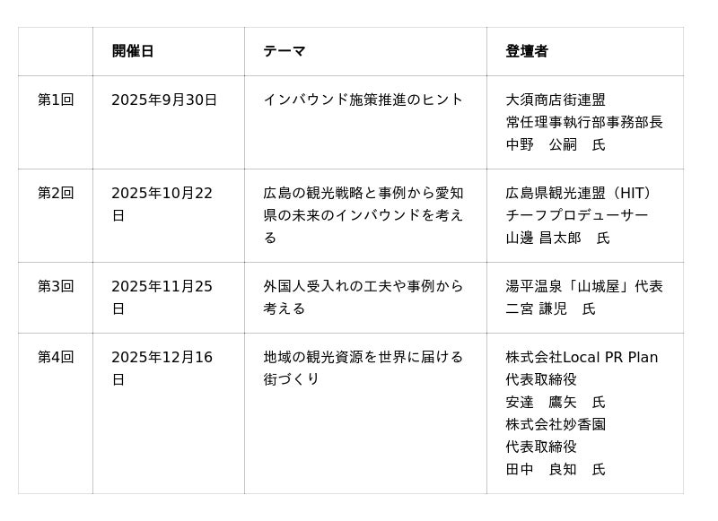 「インバウンドナイト」では、日本国内のさまざまな地域振興・インバウンド施策の事例を参考にしながら、それを中部地域の各企業がこの地域に還元し、より魅力ある中部地域を創出することを目的として開催しています。中部地域の自治体や事業者の皆さまとインバウンドに対する中部地域の価値を共創しながら取り組み、新たな発見や事業展開につなげることで、中部地域の訪日旅客者数が日本全国の水準に引き上げられることを目指しています。