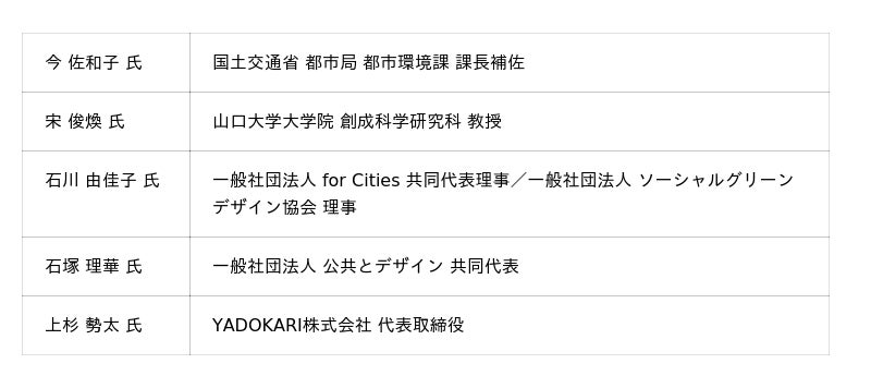 テーマは「パブリックスペースを通して拓く未来」。ゲストに石川 由佳子氏(一般社団法人 for Cities 共同代表理事/一般社団法人 ソーシャルグリーンデザイン協会 理事)、石塚 理華氏(一般社団法人 公共とデザイン 共同代表)、上杉 勢太氏(YADOKARI株式会社 代表取締役)を迎え、パブリックスペースを取り巻く都市の「人・社会」「自然・地球」「地域経済」に対する新たな役割に焦点を当て、「次の10年」の実践を発展させる道筋を探ります。パネリスト:石川 由佳子 氏、石塚 理華 氏、上杉 勢太 氏、石田 祐也、コーディネーター:田村 康一郎