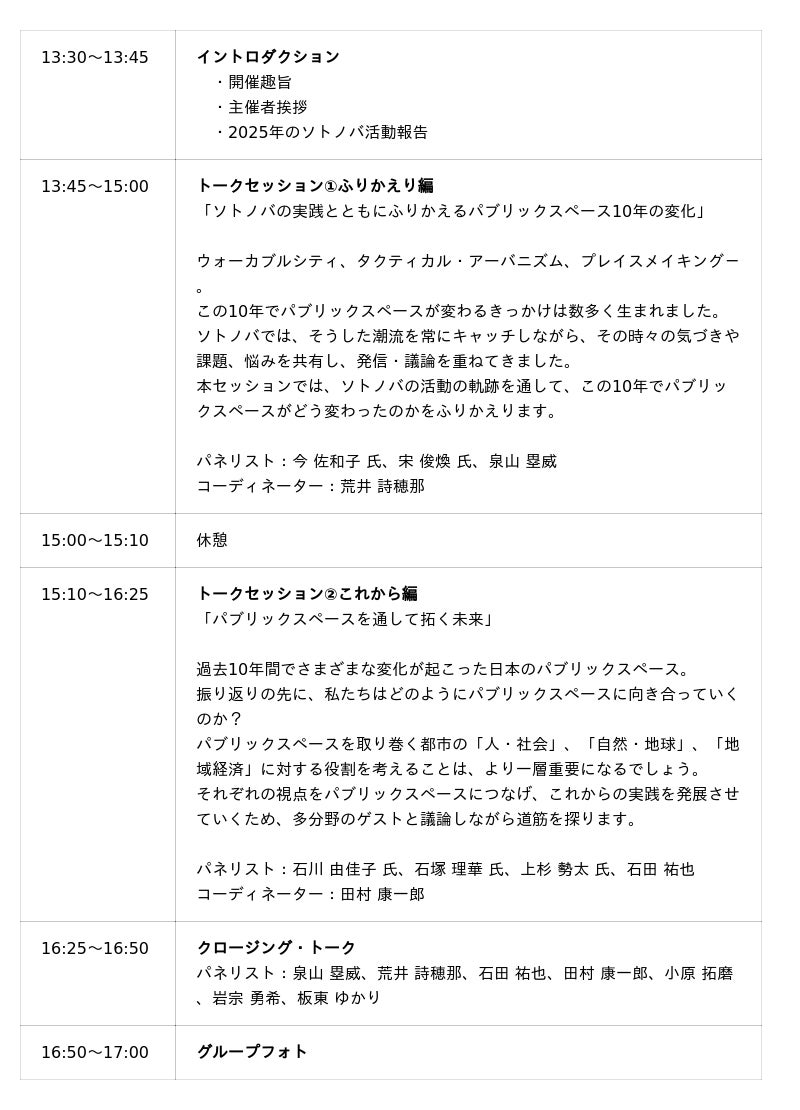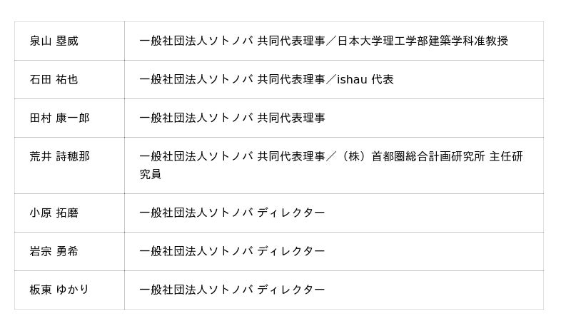 一般社団法人ソトノバ(共同代表理事:泉山塁威・荒井詩穂那・石田祐也・田村康一郎)は、ソトノバ10周年を記念し、2025年11月1日(土)にMIDORI.so Nagatacho(東京都千代田区平河町2丁目5-3 2F)にて、ソトノバ10周年アニバーサリーイベント「パブリックスペースの未来 -next10年を切り拓く-」を開催します。