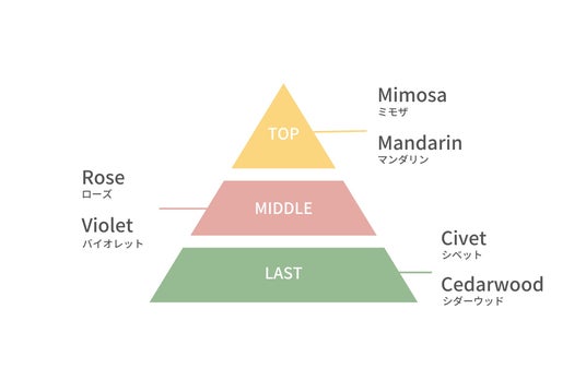 フレグランスについて軽やかで陽気なミモザと、フレッシュなマンダリンがさわやかに香り立ち、華やかなローズ、