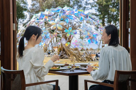 海を臨む開放的なガーデンでは、アート集団「ミラーボーラー」が手掛ける「SAKURA ART」が“HANAAKARI(ハナアカリ)”をテーマに登場!満開を迎えた桜の花がふんわりと光を灯したように見えることを意味する“ハナアカリ”という桜にまつわる美しい言葉をミラーボールで表現し、昼には太陽の光で優しく煌めき、夜はライトアップされ美しく輝く幻想的なアートをお楽しみいただけます。