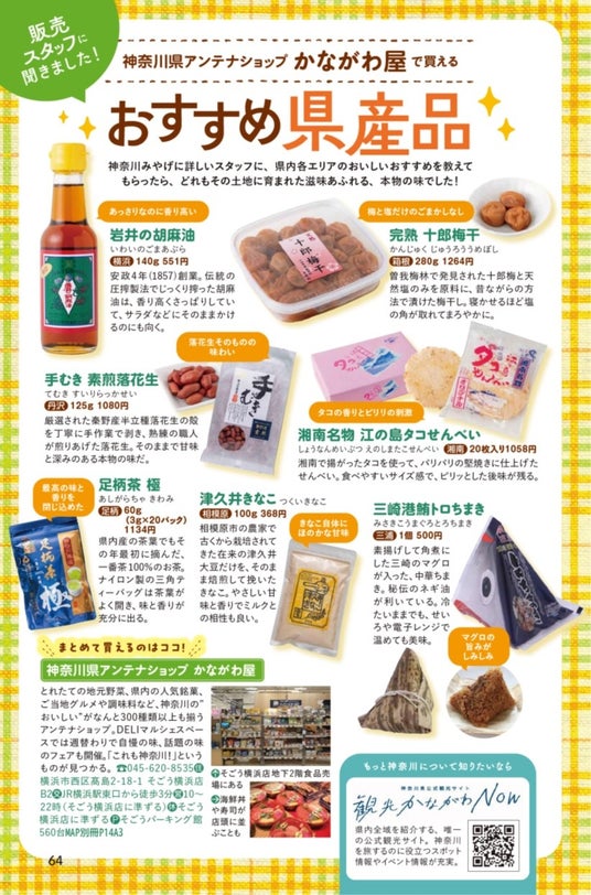 本書は神奈川県の全面的なバックアップを得て、誌面作りをしています。たとえば、神奈川県観光協会が運営する神奈川県アンテナショップかながわ屋とのコラボ特集では、知識豊富なスタッフに厳選してもらったおすすめグルメ商品を紹介。各地で育まれた滋味あふれる本物の味に迫ります。