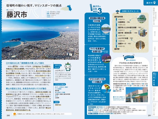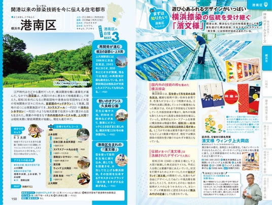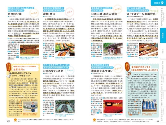 中を開けば、神奈川県33市町村・横浜市18区・川崎市7区・相模原市3区、すべてのまちごとに、まずは知ってほしい、一番おすすめの情報を特集しているほか、みどころ・グルメ・ショップ・イベントなどなど、徹底してよりすぐった施設を多数掲載しました。まさに、神奈川の大事典となっています。