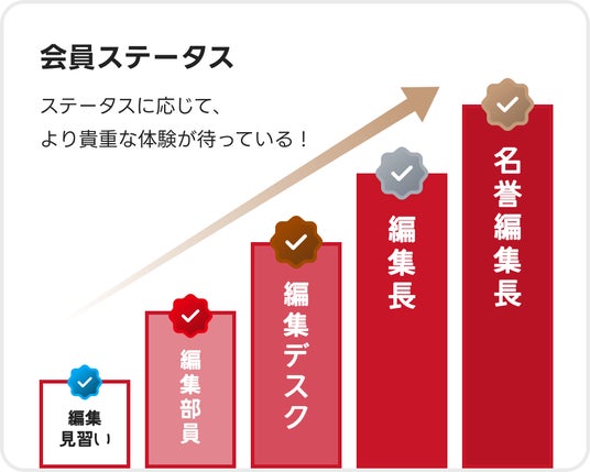 企画への参加数に応じて年間の会員ステータスが上昇します。会員ステータスは称号バッジとして、マイページに記録されます。会員ステータスが上がるとできる特別な体験も準備しております。