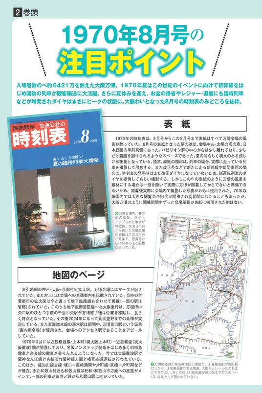 月刊誌『JTB時刻表』の前身である、国鉄監修『交通公社の時刻表』。その1970年(昭和45年)8月号を、広告を除いた当時のまま復刻しています。1970年に開催された前回の大阪万博開催時の時刻表です。