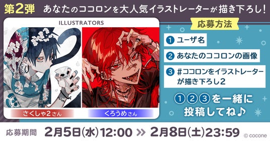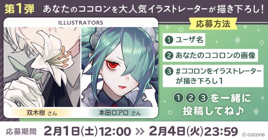 5周年を記念して、大人気イラストレーター「双木樹さん」「本田ロアロさん」「さくしゃ2さん」「くろうめさん」「城咲ロンドンさん」「なつめみくさん」「夢ノ内さん」を迎えた特別なSNSキャンペーンを開催中です。本キャンペーンでは、お客様が作成した「ココロン(アバター)の画像」を「ユーザー名・対象のハッシュタグ」とともにXに投稿することで応募が完了。