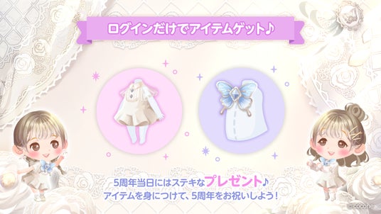 5周年を記念した福袋(着せかえアイテム)が、7日間の期間限定で販売中です。あたたかな春の訪れを告げる妖精をイメージしたココロンのファッションアイテムと、レースと花をまとった白基調のココリウムアイテムを手に入れることができます。