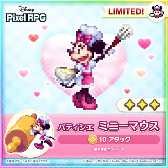 かわいらしい衣装はもちろんのこと、少ない消費SPで攻撃が可能なスキルと、条件を満たせばSPを回復できるEXスキルも特徴的な最新キャラクターです。お菓子作りに挑む新たな「ミニーマウス」の姿を、どうぞお見逃しなく。