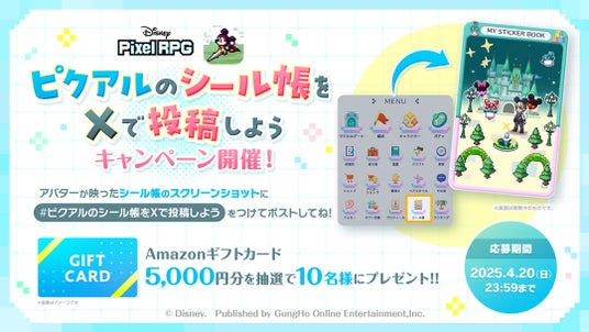 『ディズニー ピクセルRPG』公式Xでは、抽選で5,000円分のAmazonギフトカードが当たる「ピクアルのシール帳をXで投稿しようキャンペーン」を本日より開催いたします。『ディズニー ピクセルRPG』公式Xアカウントをフォローして、アバターが映ったシール帳のスクリーンショットを、キャンペーン用のハッシュタグと一緒に投稿することで応募完了となります。皆様、奮ってご参加ください。