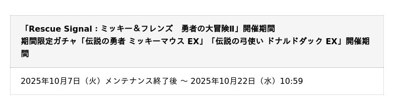 あわせて、新キャラクター「伝説の勇者 ミッキーマウス EX」、「伝説の弓使い ドナルドダック EX」がラインナップされた期間限定ガチャも開催いたします。どちらのキャラクターも、本日のアップデートより追加された新要素「スタイル※」や、バトル中の特別な演出などが追加された「EXキャラクター」となります。