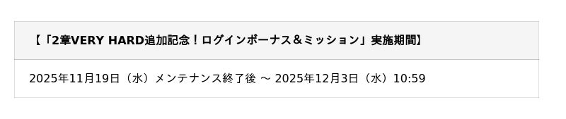 ストーリー2章「VERY HARD(前半)」の追加を記念して、期間限定で「プレミアムガチャチケット」や「限界突破ストーンの欠片」など豪華報酬が獲得可能なログインボーナスとミッションも開催いたします。