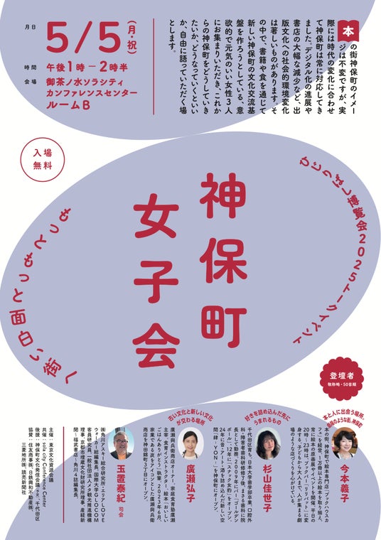 本の街神保町のイメージは不変ですが、実際には時代の変化に合わせて神保町は常に対応してきました。デジタル化の進展や書店の大幅な減少など、出版文化への社会的環境変化は著しいものがあります。その中で、書籍や食を通じて新しい神保町の文化交流基盤を作ろうとしている、意欲的で元気のいい女性3人にお集まりいただき、これからの神保町をどうしていきたいか、どうなっていくといいか、自由に語っていただく場とします。
