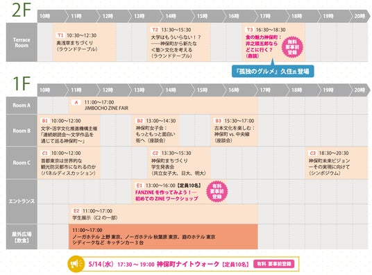当日は、10時から20時30分まで、企画展示やセミナー、シンポジウム、飲食、などが開催されています。事前申し込み不要(一部、事前申し込み必須)にて、ご興味や関心のあるものは自由に出入りしてご参加ください。(各催しは、展示やお食事を除き、開場は開始30分間からとなっています)「食の魅力神保町:井之頭五郎ならどこに行く?」神保町食文化に関する鼎談