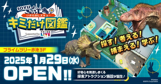 株式会社 学研ホールディングス(東京・品川/代表取締役社長:宮原博昭)のグループ会社、株式会社 Gakken(東京・品川/代表取締役社長:南條達也)が発行する本格図鑑「学研の図鑑LIVE」シリーズとコラボした、株式会社ソユー(秋田・秋田市/代表取締役社長:今野秀一)運営の探索アトラクション施設「いきものレスキュー キミだけ図鑑」が、2025年1月29日(水)にプライムツリー赤池店(愛知県日進市)にオープンいたします。