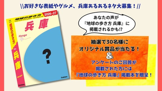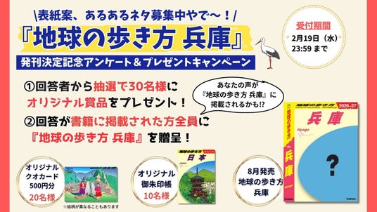 『地球の歩き方 兵庫』の制作決定を記念し、2025年2月5日より創刊記念アンケート&プレゼントキャンぺーンがスタート。『地球の歩き方 兵庫』の表紙を飾るイラストやおすすめスポット&グルメ、ご当地あるあるネタなどについて、兵庫県民をはじめ、兵庫県に興味・関心のある読者の生の声を大募集しています。お寄せいただいた貴重なご意見や体験談が『地球の歩き方 兵庫』に掲載された場合、掲載本を贈呈。また、アンケートにお答えいただいた方の中から抽選で30名様に、地球の歩き方オリジナルクオカードなどのプレゼントが当たります。(締切:2025年2月19日)
