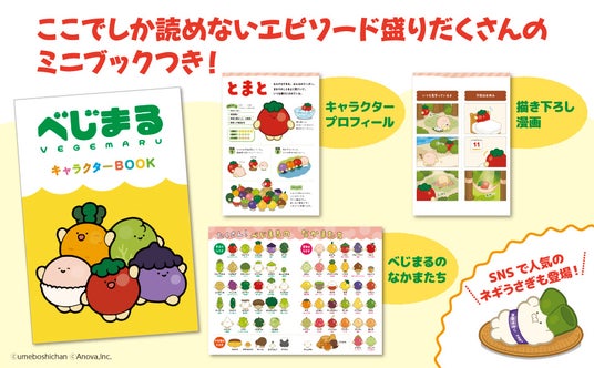SNS総フォロワー約145万人(※)の野菜と果物の妖精。「とまと」や「にんじん」などの定番野菜から、珍しい果物まで個性豊かなたくさんのキャラクターがいます。べじまるは、POP UPショップでのグッズ完売多数、ネギうさぎは2024年に行われたクラウドファンディングで、目標金額を800%以上で達成するなど、SNSを中心に人気急上昇中! そんなファン待望のキャラクターBOOKが発売されます。