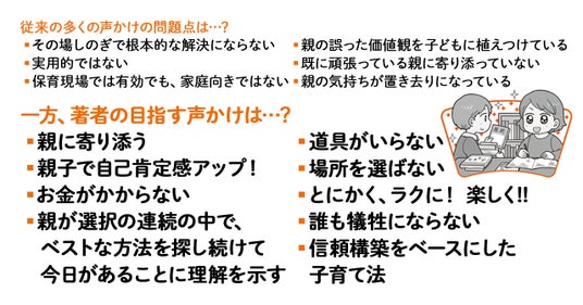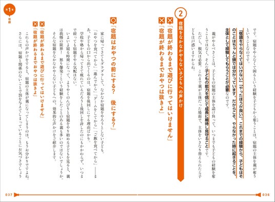 ▲親子関係を悪化させるのも、信頼を生むのも声かけ次第。×印のフレーズを口にしたことがある人は、今からでも遅くはありません。本書で紹介している正しいフレーズをそのまま真似るだけで、子どもの言動に必ず良い変化が生じます。