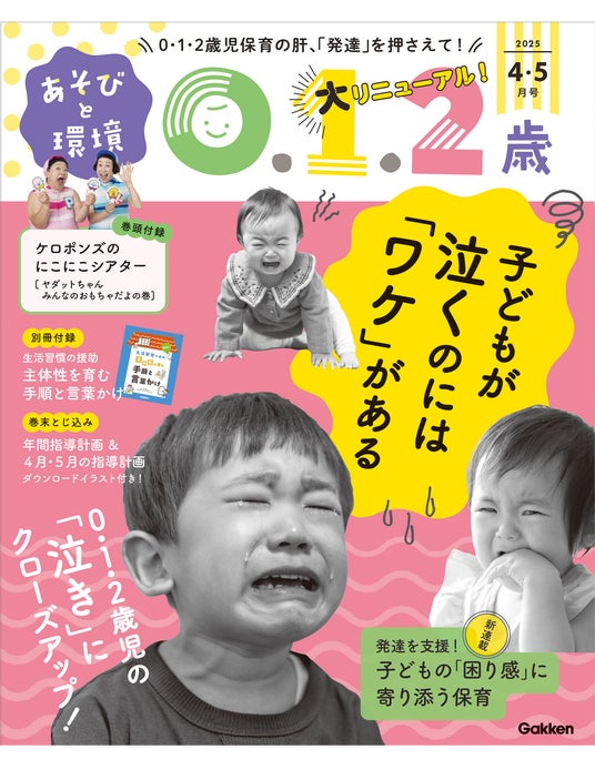 ▲『あそびと環境0.1.2歳』4・5月号は、0・1・2歳児の「泣き」を51ページで大特集! 別冊付録「生活習慣の援助 主体性を育む手順と言葉かけ」、カード付録「ケロポンズのにこにこシアター」、とじ込み付録「0・1・2歳児 年間指導計画」の豪華付録付きです。