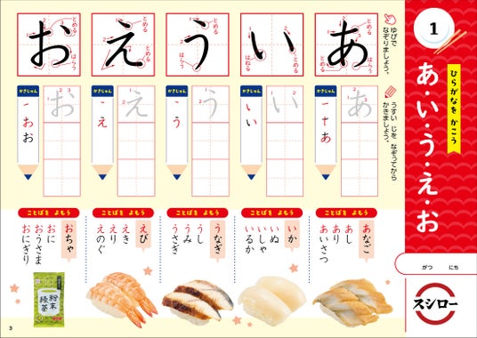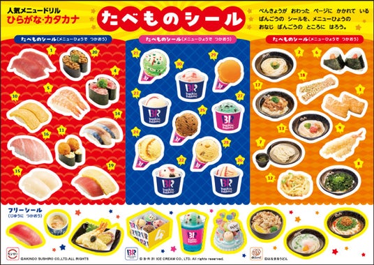 今回登場したのは、『スシロー・サーティワン アイスクリーム・はなまるうどん ひらがな・カタカナ』、『人気メニュードリル ピザーラ・サーティワン アイスクリーム・不二家 はじめての分数』の2冊です。