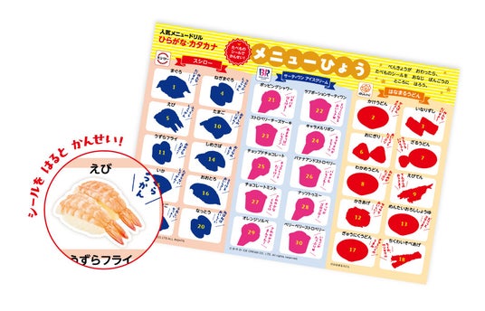 スシロー、サーティワン アイスクリーム、はなまるうどんの人気メニューで『ひらがな・カタカナ』が、ピザーラ、サーティワン アイスクリーム、不二家の人気メニューで『分数』が学べるドリルです。