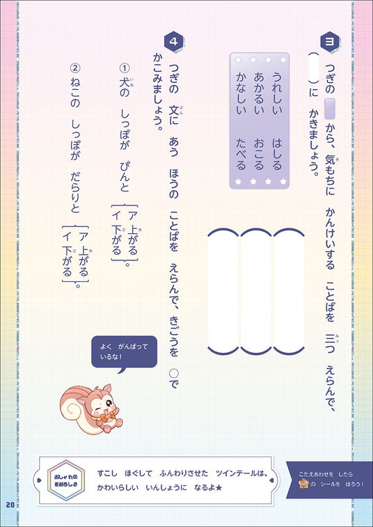 読解の文章は、動物や食べ物、ファッションやおしゃれなど、お子さんが大好きなテーマがいっぱい! 「もっと読みたい!」という気持ちが自然と育ちます。ワクワクしながら学習できるドリルで、読解力を伸ばしましょう!