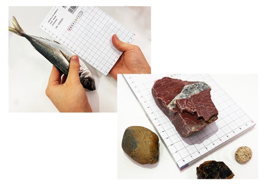▲左:側面は約18cmの定規に。右:方眼の上に集めた石をのせて記録写真をパシャリ。
