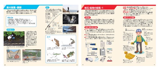 『魚』では釣り・採集の方法や飼育について、『岩石・鉱物・化石』では石ひろいの方法や採集に適した服装の紹介など、野外での活動にぴったりな情報を掲載しています。